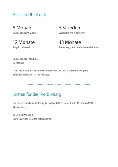 Am Ende der Fortbildung wird ein Zertifikat ausgestellt. Voraussetzung für die Ausstellung des Zertifikats ist die Teilnahme an beiden Workshops, der Abschluss aller Lehrbriefe und die Teilnahme an allen Online-Seminaren sowie persönlichen Gesprächen. Werden diese Voraussetzungen nicht erfüllt, wird kein Zertifikat ausgestellt.